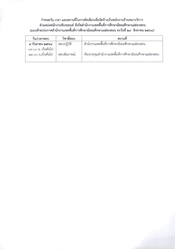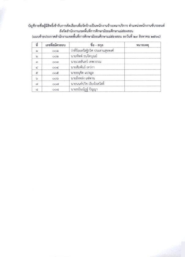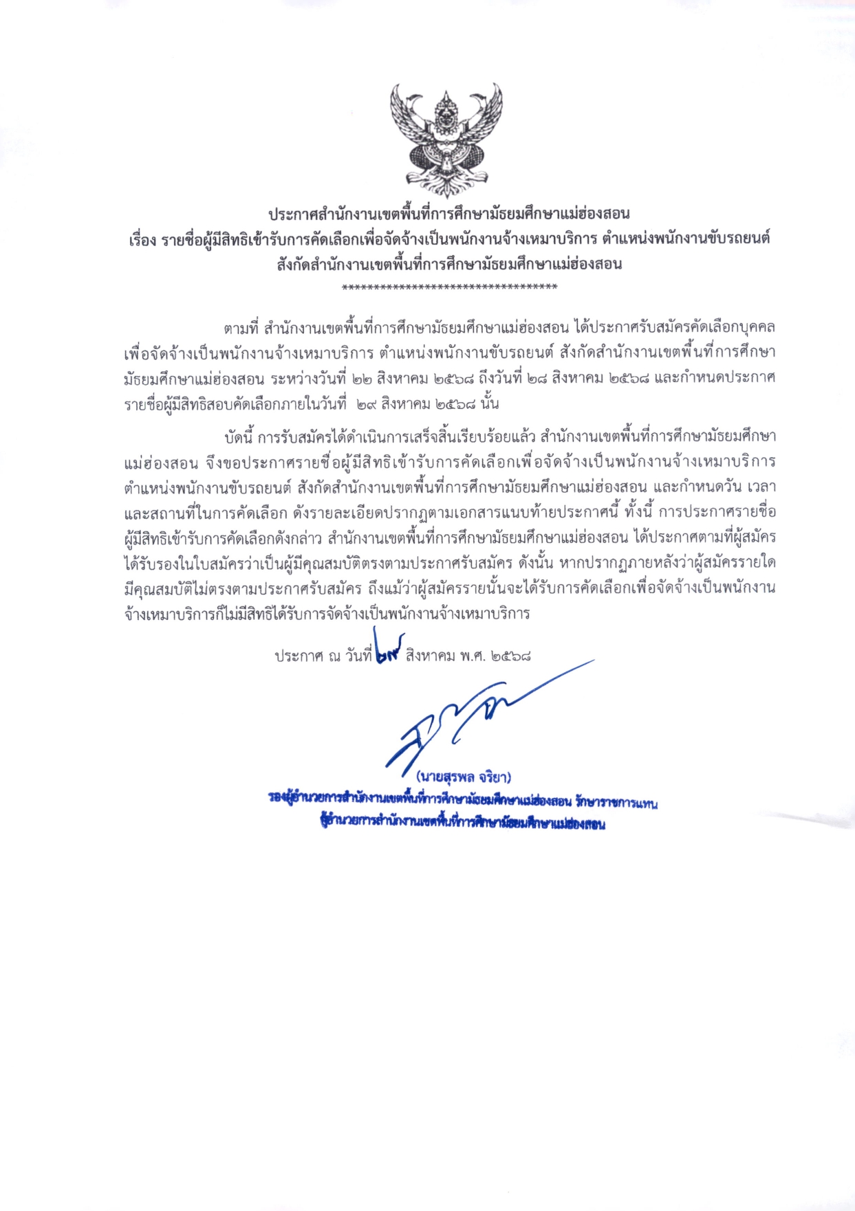 ประกาศสำนักงานเขตพื้นที่การศึกษามัธยมศึกษาแม่ฮ่องสอน เรื่อง รายชื่อผู้มีสิทธิเข้ารับการคัดเลือกเพื่อจัดจ้างเป็นพนักงานจ้างเหมาบริการ ตำแหน่งพนักงานขับรถยนต์ สังกัดสำนักงานเขตพื้นที่การศึกษามัธยมศึกษาแม่ฮ่องสอน