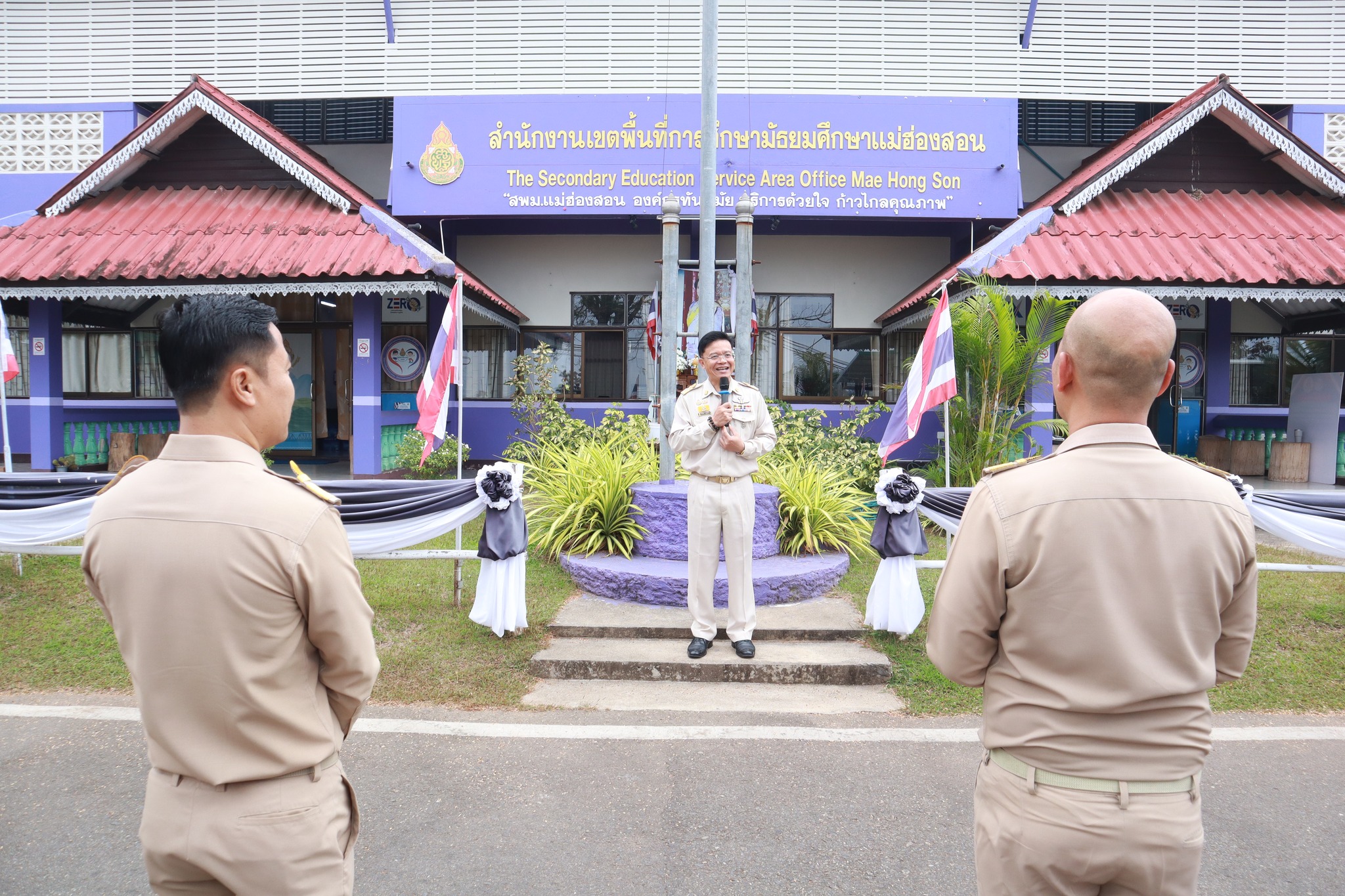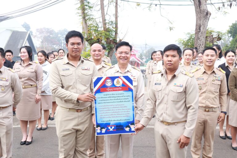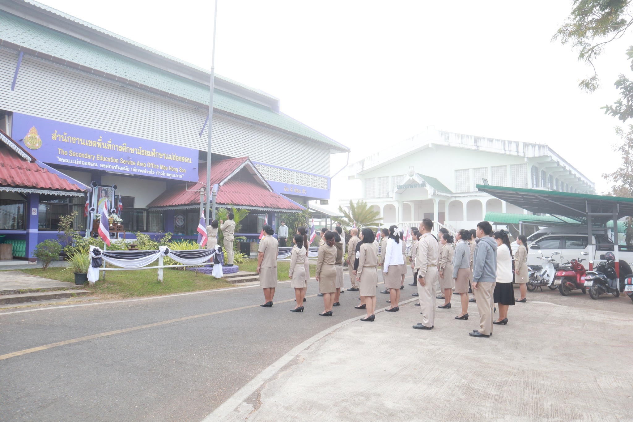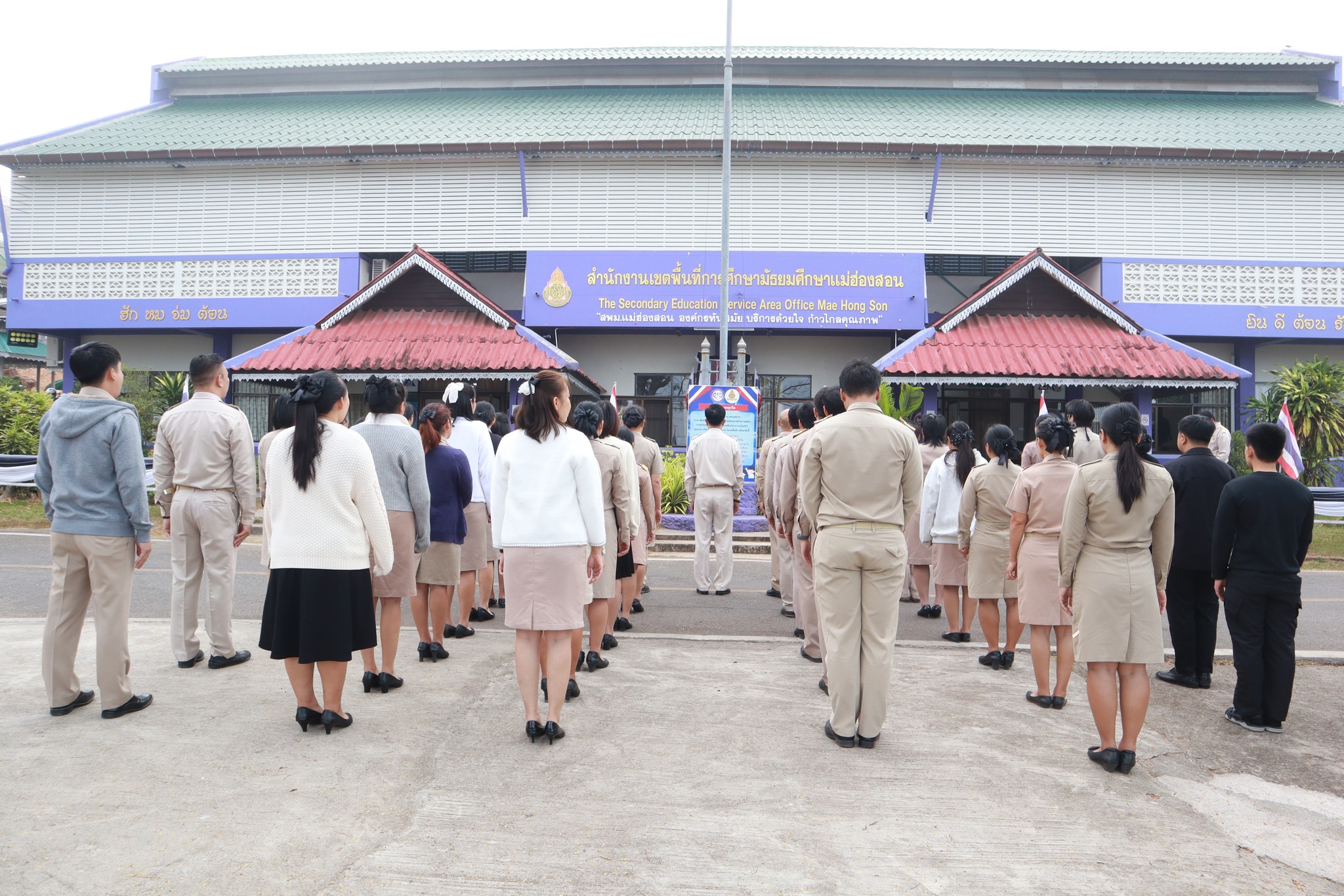 วันจันทร์ที่ 2 กุมภาพันธ์ 2569 เวลา 08.30 น. นายธีรภัทร วงษ์สว่าง ผู้อำนวยการสำนักงานเขตพื้นที่การศึกษามัธยมศึกษาแม่ฮ่องสอน พร้อมด้วย นายสุรพล จริยา รองผู้อำนวยการสำนักงานเขตพื้นที่การศึกษามัธยมศึกษาแม่ฮ่องสอน นายบรรดิษฐ์ ม่วงอ่อง รองผู้อำนวยการสำนักงานเขตพื้นที่การศึกษามัธยมศึกษาแม่ฮ่องสอน นำผู้อำนวยการกลุ่มภารกิจ ข้าราชการ และเจ้าหน้าที่ในสังกัด เข้าร่วมกิจกรรมเคารพธงชาติ สวดมนต์ ร้องเพลงสรรเสริญพระบารมี และเพลงสดุดีจอมราชา เพื่อแสดงความจงรักภักดีและถวายพระพรชัยมงคลต่อสถาบันพระมหากษัตริย์ พร้อมกล่าวคำปฏิญญาเขตสุจริต ณ บริเวณหน้าสำนักงานเขตพื้นที่การศึกษามัธยมศึกษาแม่ฮ่องสอน ตำบลจองคำ อำเภอเมืองแม่ฮ่องสอน จังหวัดแม่ฮ่องสอน
