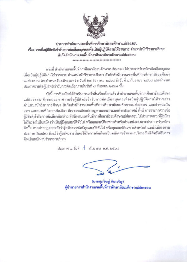 ประกาศรายชื่อผู้มีสิทธิเข้ารับการคัดเลือกบุคคลเพื่อเป็นผู้ปฏิบัติงานให้ราชการ ตำแหน่งนักวิชาการศึกษา สังกัดสำนักงานเขตพื้นที่การศึกษามัธยมศึกษาแม่ฮ่องสอน