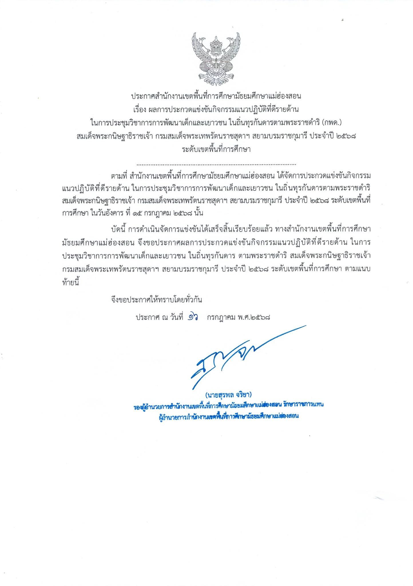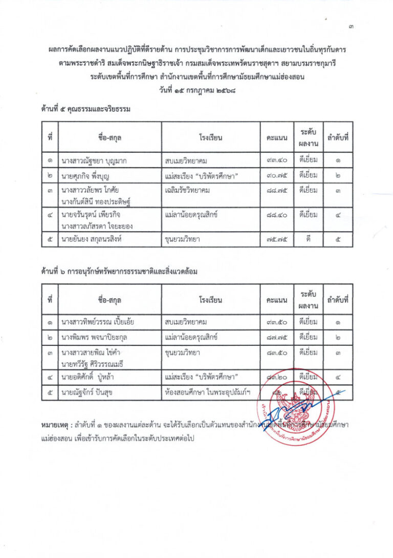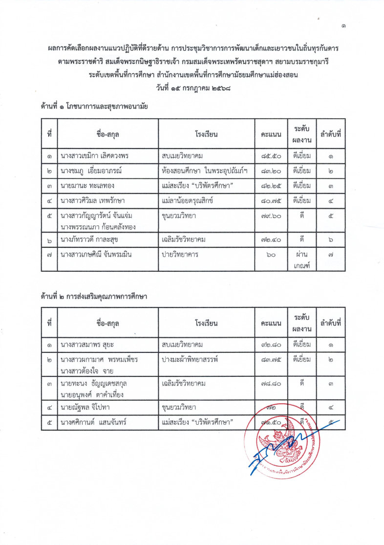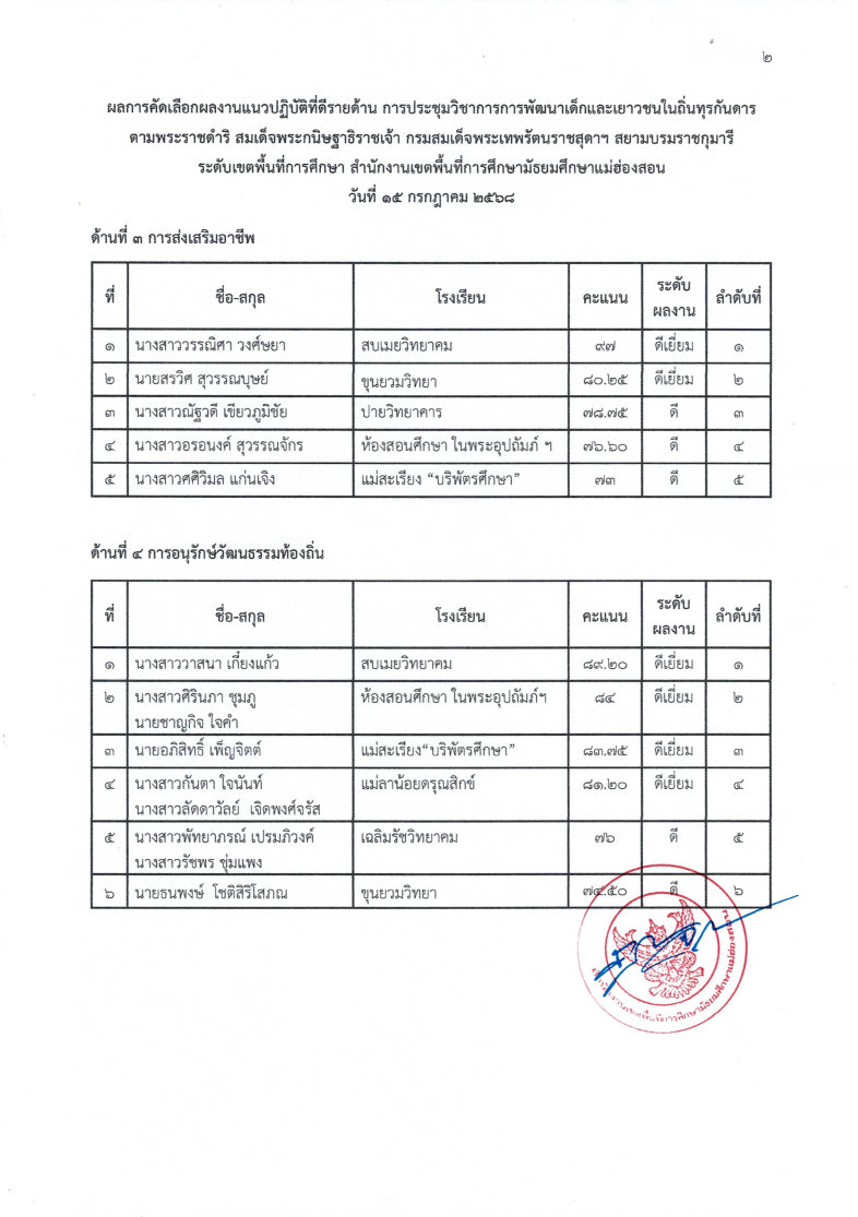 ประกาศสำนักงานเขตพื้นที่การศึกษามัธยมศึกษาแม่ฮ่องสอน เรื่อง ผลการประกวดแข่งขันกิจกรรมแนวปฏิบัติที่ดีรายด้าน ในการประชุมวิชาการการพัฒนาเด็กและเยาวชน ในถิ่นทุรกันดารตามพระราชดำริ (กพด.) สมเด็จพระกนิษฐาธิราชเจ้า กรมสมเด็จพระเทพรัตนราชสุดาฯ สยามบรมราชกุมารี ประจำปี ๒๕๖๘ ระดับเขตพื้นที่การศึกษา