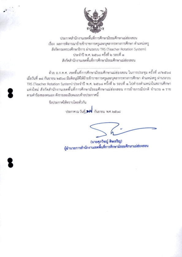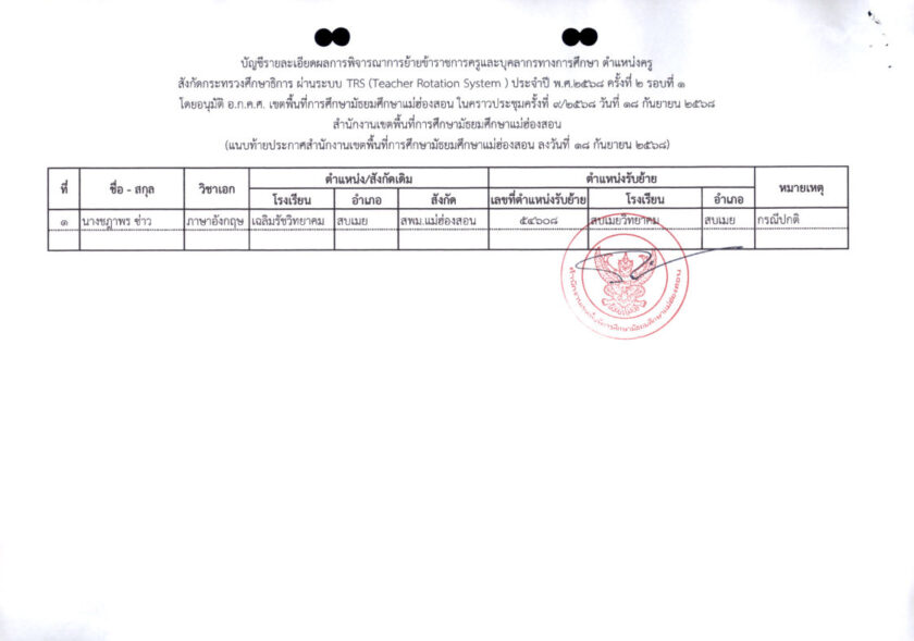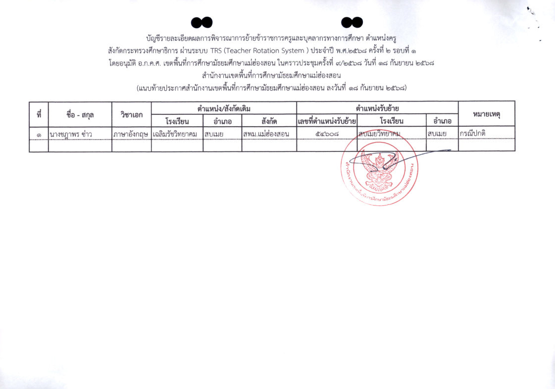 ประกาศสำนักงานเขตพื้นที่การศึกษามัธยมศึกษาแม่ฮ่องสอน เรื่อง ผลการพิจารณาย้ายข้าราชการครูและบุคลากรทางการศึกษา ตำแหน่งครู สังกัดกระทรวงศึกษาธิการ ผ่านระบบ TRS (Teacher Rotation System) ประจำปี พ.ศ. ๒๕๖๘ ครั้งที่ ๒ รอบที่ ๑ สังกัดสำนักงานเขตพื้นที่การศึกษามัธยมศึกษาแม่ฮ่องสอน