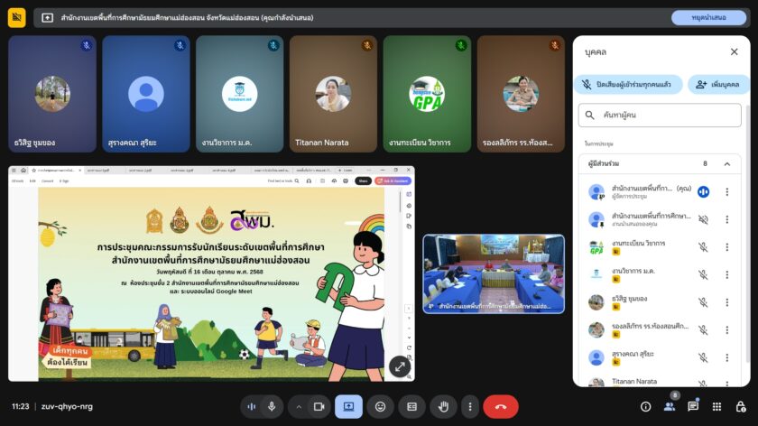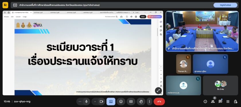 วันที่ 16 ตุลาคม 2568 เวลา 10.30 น. นายศุภวิชญ์ ดิษเจริญ ผู้อำนวยการสำนักงานเขตพื้นที่การศึกษามัธยมศึกษาแม่ฮ่องสอน มอบหมายให้ นายสุรพล จริยา รองผู้อำนวยการสำนักงานเขตพื้นที่การศึกษามัธยมศึกษาแม่ฮ่องสอน พร้อมด้วยนางสาววรินทร ปัดกอง รองผู้อำนวยการสำนักงานเขตพื้นที่การศึกษามัธยมศึกษาแม่ฮ่องสอน เป็นประธานการประชุมคณะกรรมการรับนักเรียนระดับเขตพื้นที่การศึกษา ปีการศึกษา 2569 ผ่านช่องทางออนไลน์ ระบบ Google Meet โดยมีเจ้าหน้าที่กลุ่มส่งเสริมการจัดการศึกษาเข้าร่วมประชุม ณ ห้องประชุม ชั้น 2 สำนักงานเขตพื้นที่การศึกษามัธยมศึกษาแม่ฮ่องสอน ตำบลจองคำ อำเภอเมืองแม่ฮ่องสอน จังหวัดแม่ฮ่องสอน