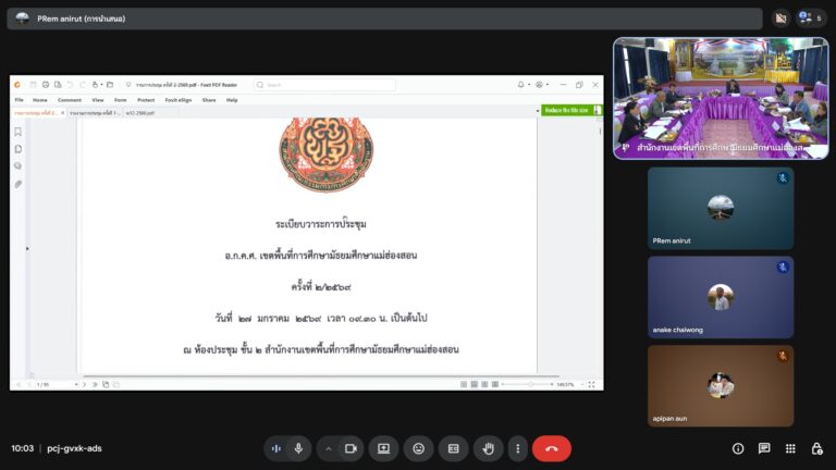 วันที่ 27 มกราคม พ.ศ. 2569 เวลา 09.30 น. สำนักงานเขตพื้นที่การศึกษามัธยมศึกษาแม่ฮ่องสอน จัดประชุมคณะอนุกรรมการข้าราชการครูและบุคลากรทางการศึกษา (อ.ก.ค.ศ.) เขตพื้นที่การศึกษามัธยมศึกษาแม่ฮ่องสอน ครั้งที่ 2/2569 โดยมีนายนายธีรภัทร วงษ์สว่าง ผู้อำนวยการสำนักงานเขตพื้นที่การศึกษามัธยมศึกษาแม่ฮ่องสอน พร้อมด้วยคณะกรรมการ อ.ก.ค.ศ. เขตพื้นที่การศึกษาฯ ผู้ทรงคุณวุฒิ และเจ้าหน้าที่กลุ่มบริหารงานบุคคล เข้าร่วมประชุม ณ ห้องประชุมสำนักงานเขตพื้นที่การศึกษามัธยมศึกษาแม่ฮ่องสอน ตำบลจองคำ อำเภอเมืองแม่ฮ่องสอน จังหวัดแม่ฮ่องสอน พร้อมทั้งผ่านระบบออนไลน์ Google Meet เพื่ออำนวยความสะดวกแก่คณะกรรมการที่เข้าร่วมประชุมจากพื้นที่ต่าง ๆ ให้สามารถมีส่วนร่วมในการพิจารณาและหารือข้อราชการได้อย่างทั่วถึงและมีประสิทธิภาพ