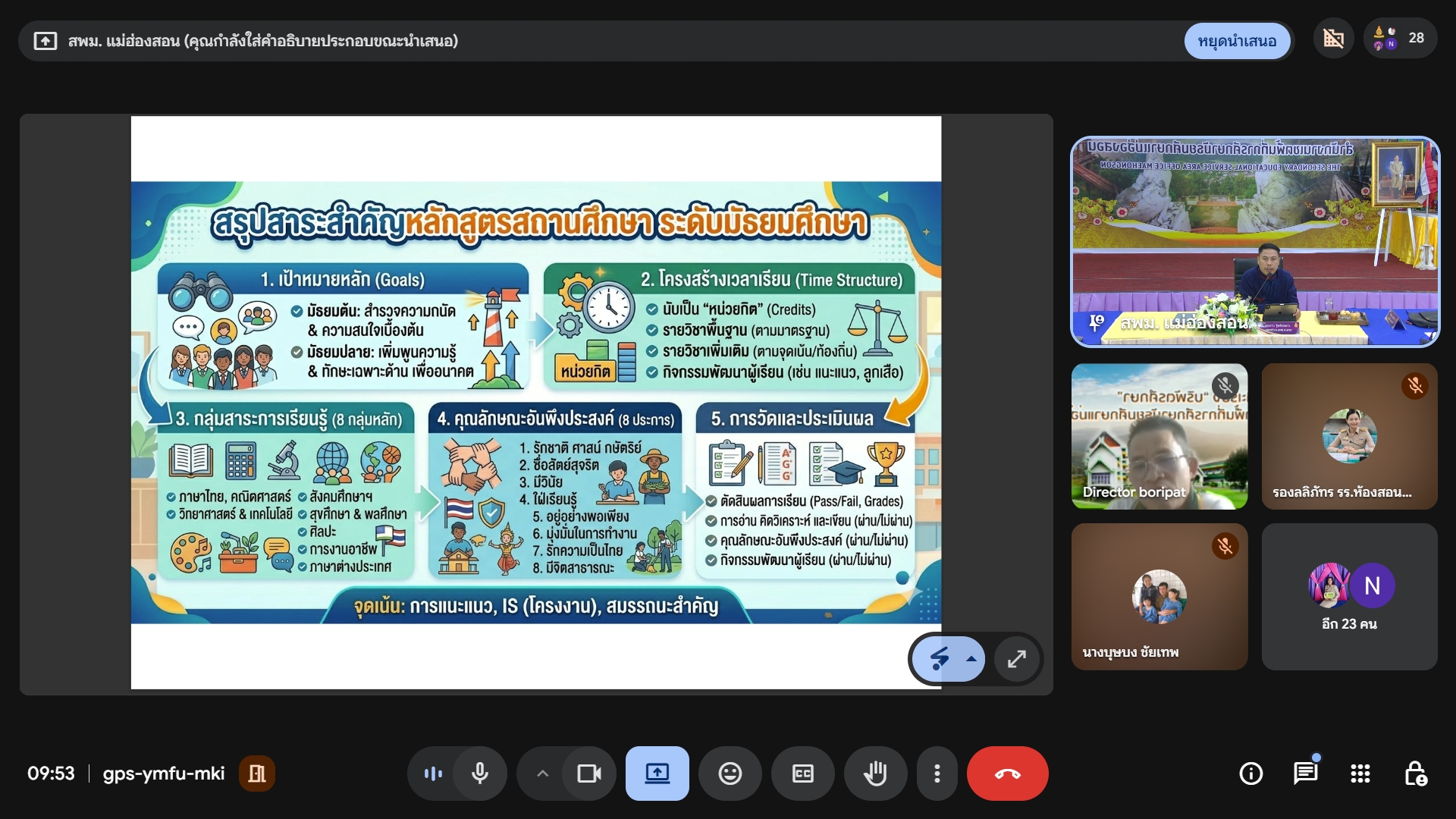 วันที่ 22 เมษายน 2569 สำนักงานเขตพื้นที่การศึกษามัธยมศึกษาแม่ฮ่องสอน จัดประชุมเชิงปฏิบัติการสร้างความเข้าใจแนวทางการขับเคลื่อนการยกระดับคุณภาพการจัดการศึกษา ระดับมัธยมศึกษา และการพัฒนาหลักสูตรสถานศึกษา ผ่านระบบออนไลน์ Google Meet ณ ห้องประชุมสำนักงานเขตพื้นที่การศึกษามัธยมศึกษาแม่ฮ่องสอน ตำบลจองคำ อำเภอเมืองแม่ฮ่องสอน จังหวัดแม่ฮ่องสอน